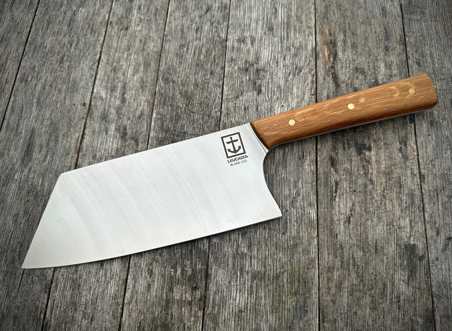 With a 7.5-inch cutting edge, 3-inch blade height, and 0.125-inch spine thickness, El Choppo delivers ideal balance, weight, and power for slicing, dicing, and mincing. Its tumbled and distressed finish adds a rugged character that stands out on any prep station.