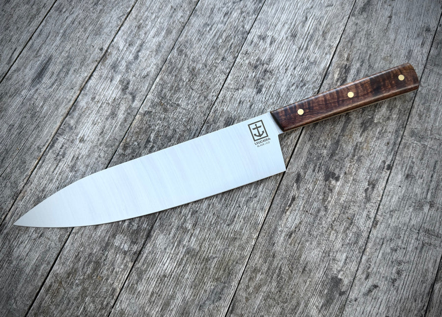 Our 8.5" Chef model is inspired by the legendary cutlery of Japan, featuring a thin, hard, high-performance blade and our full-tang interpretation of the classic Japanese 'Wa' handle that features simple, straight lines and a slight taper from back to front. The blade is made from AEB-L Swedish stainless steel, heat-treated to 61 Rockwell hardness w/ cryogenic treatment.