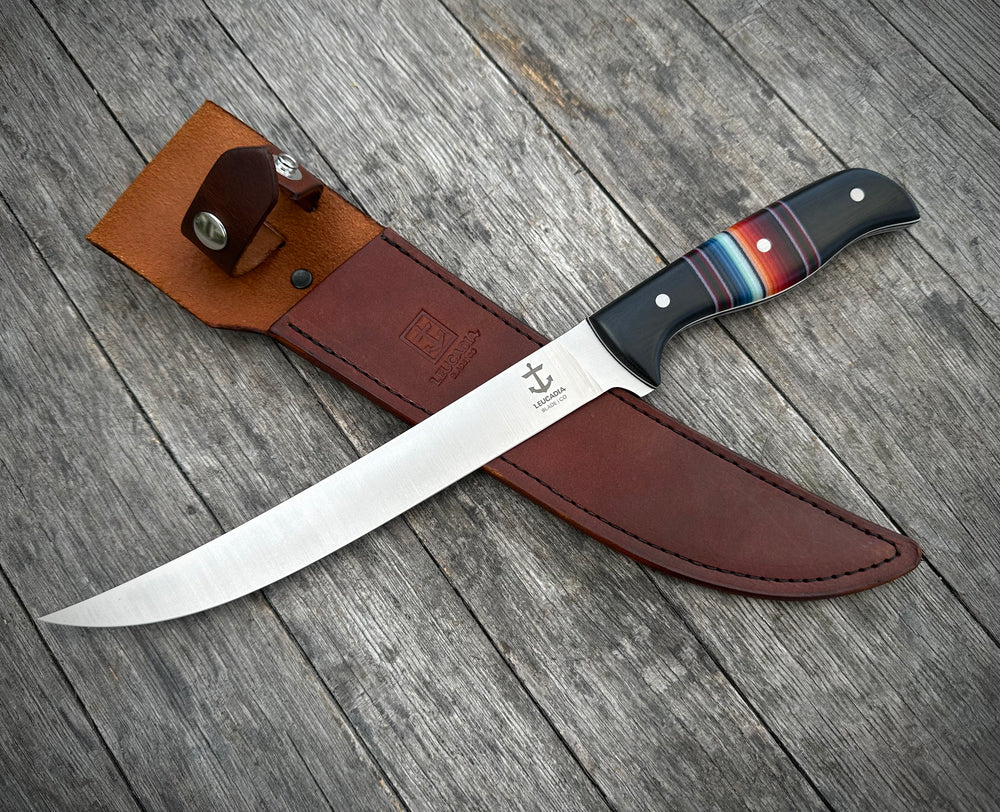 The Hamachi is an 8” fillet knife with medium-stiff flex; .100” thick at the spine with distal taper & very thin behind the edge. Crafted from a choice of two stainless steels (AEB-L or CPM MagnaCut) the Mexican Blanket Hamachi offers unparalleled performance for precision cutting and filleting tasks. AEB-L offers exceptional toughness and ease of sharpening. MagnaCut is known for its exceptional edge retention, corrosion resistance, and toughness.