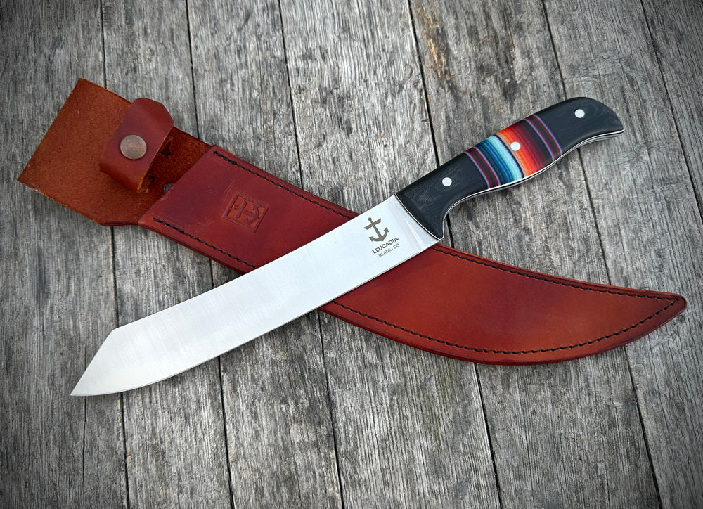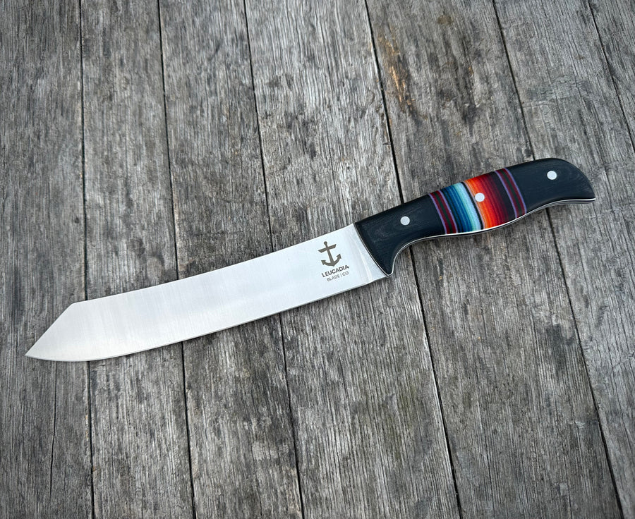 The custom Mexican Blanket handle is handcrafted by Anthony in our shop using ten carefully layered pieces of micarta and G10 to create our beloved pattern. The layered construction technique results in a handle that’s not only visually striking but also incredibly durable and tough.