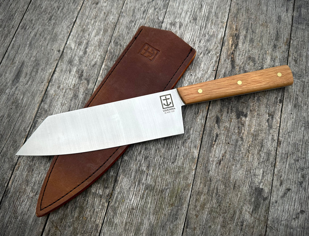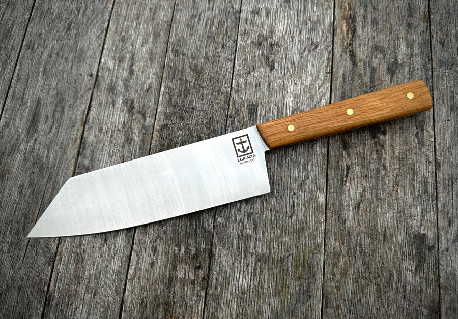 This is our 7" Bunka knife with handles made of stabilized American White Oak whiskey barrel wood straight from the cellars of our friends at Cutwater Spirits here in San Diego.