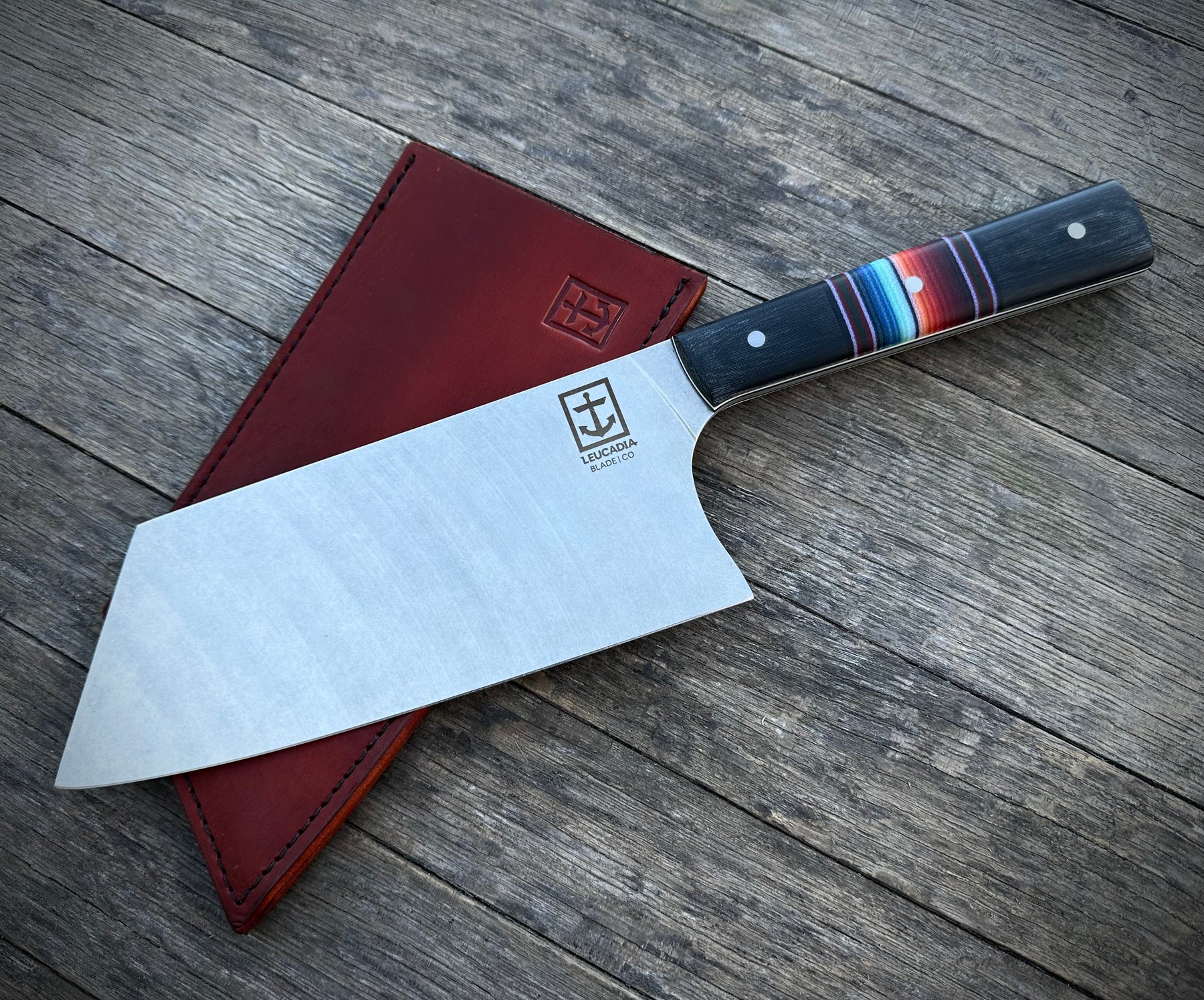These custom, handmade handles are crafted by Anthony in our shop, featuring ten layered pieces of Micarta and G10 in the iconic Mexican Blanket pattern. This layered construction is visually striking, highly durable, and comfortable, giving every knife a unique look and feel.Designed with our carne asada and pollo asada enthusiasts in mind, El Choppo is a versatile powerhouse that excels as an all-purpose chef’s knife. Its generous blade surface makes it effortless to scoop and transfer chopped meats, vegetables, and other ingredients, ensuring a smooth, efficient cooking experience.